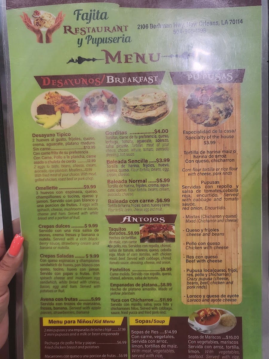 Welcome to Fajita Restaurant y pupuseria, a hidden gem located at 2106 Behrman Hwy, New Orleans. This inviting eatery serves up a diverse and authentic menu that beautifully blends Central American flavors. Diners rave about the quesabirria tacos, taquitos, and creamy quesadillas, all praised for their comforting qualities and delicious taste. The fajitas are a must-try, offering generous portions at a fair price.